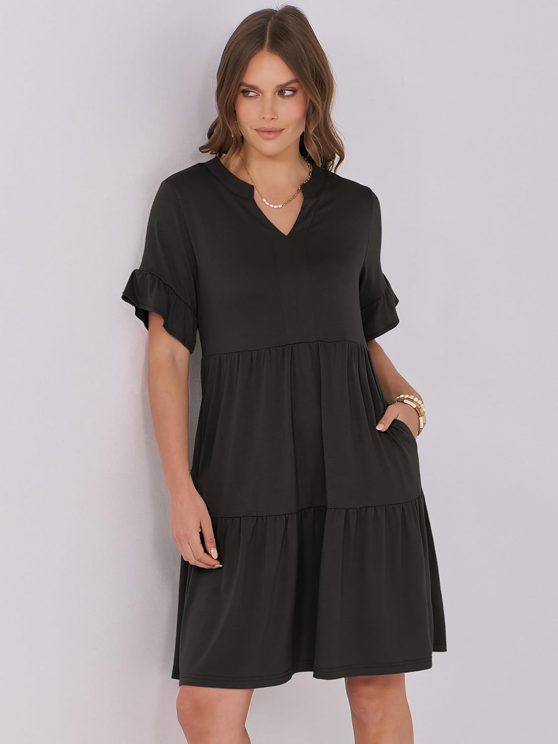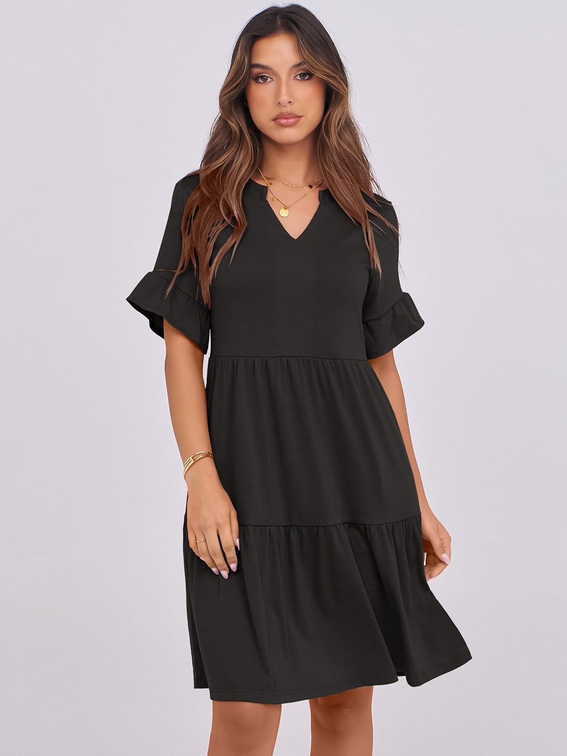 ANRABESS Womens Summer 2025 Trendy Ruffle Short Sleeve V Neck A Line Tiered Flowy Loose Casual Mini Beach Dress with Pockets