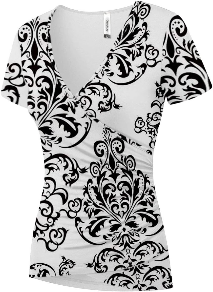 Beauhuty Women’s Top Deep V Neck Slim Fitted T-Shirt Front Wrap Ruched Short Sleeve Tee