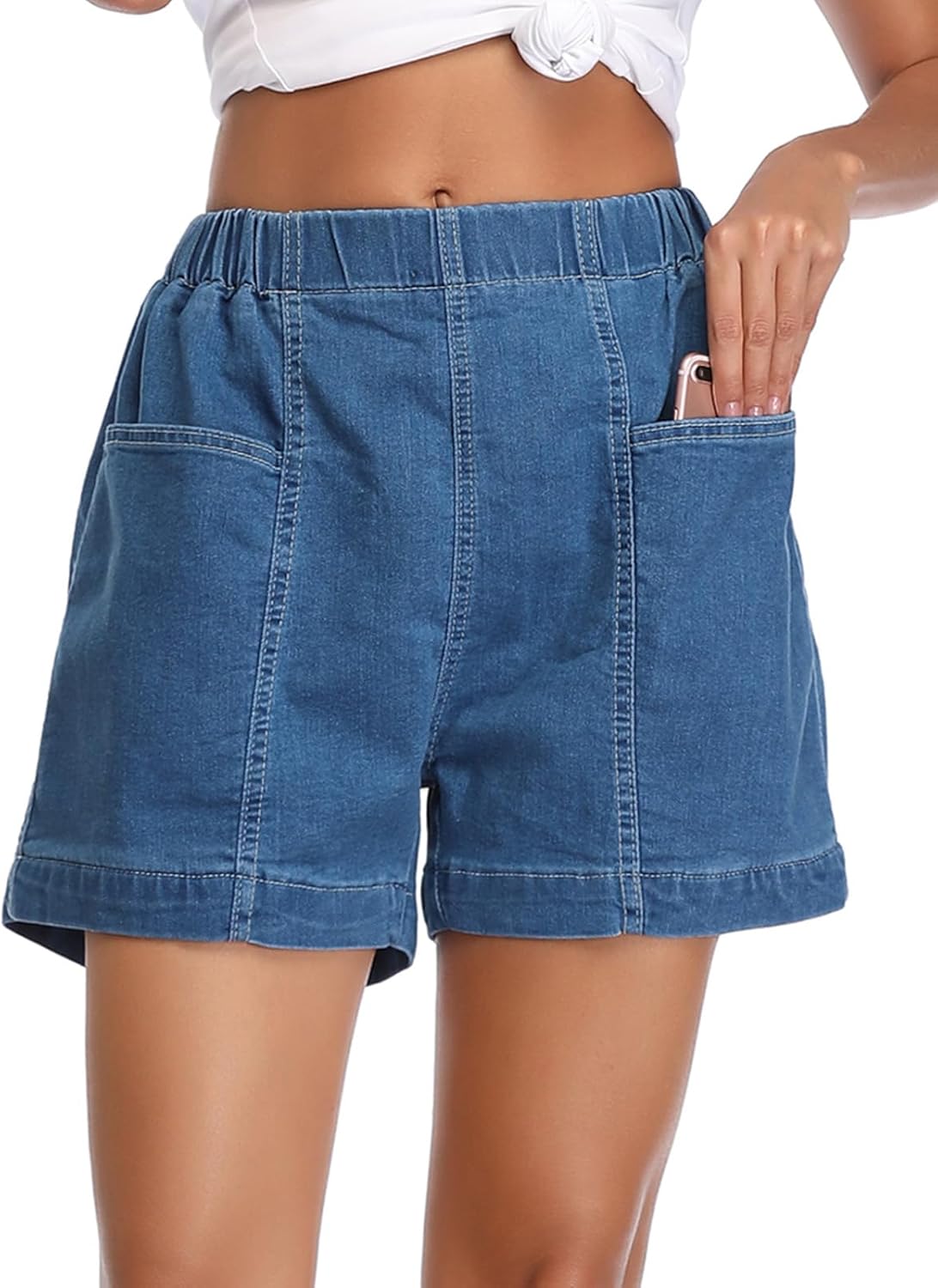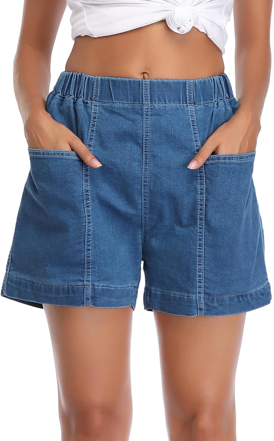 Fuinloth Women’s Denim Shorts, Elastic Wasit Mid Rise Loose Fit with 2 Front Pockets, Stretchy Jeans Short Pants