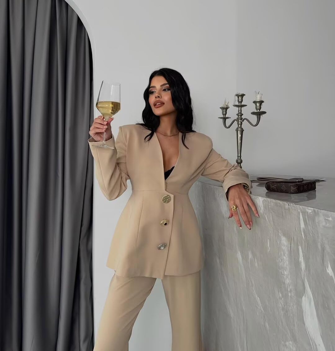 Gen Women’s Long 2 Piece Suit Jacket+Pants Slim Fit 1 Button High Street Luxury Womens Clothing Pant Set