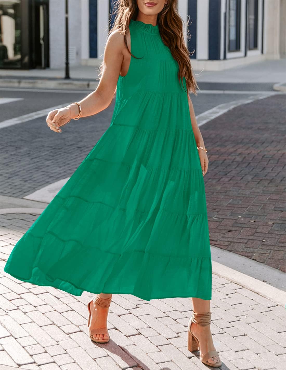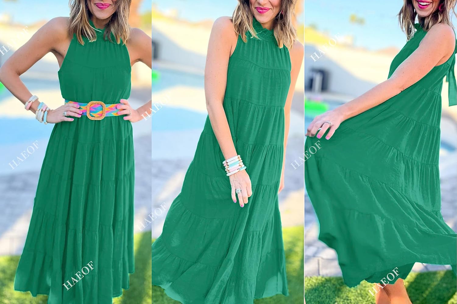 HAEOF Women’s Summer Sleeveless Halter Midi Maxi Dress Casual Pleated Tiered Flowy Beach Vacation Long Dresses Sundress
