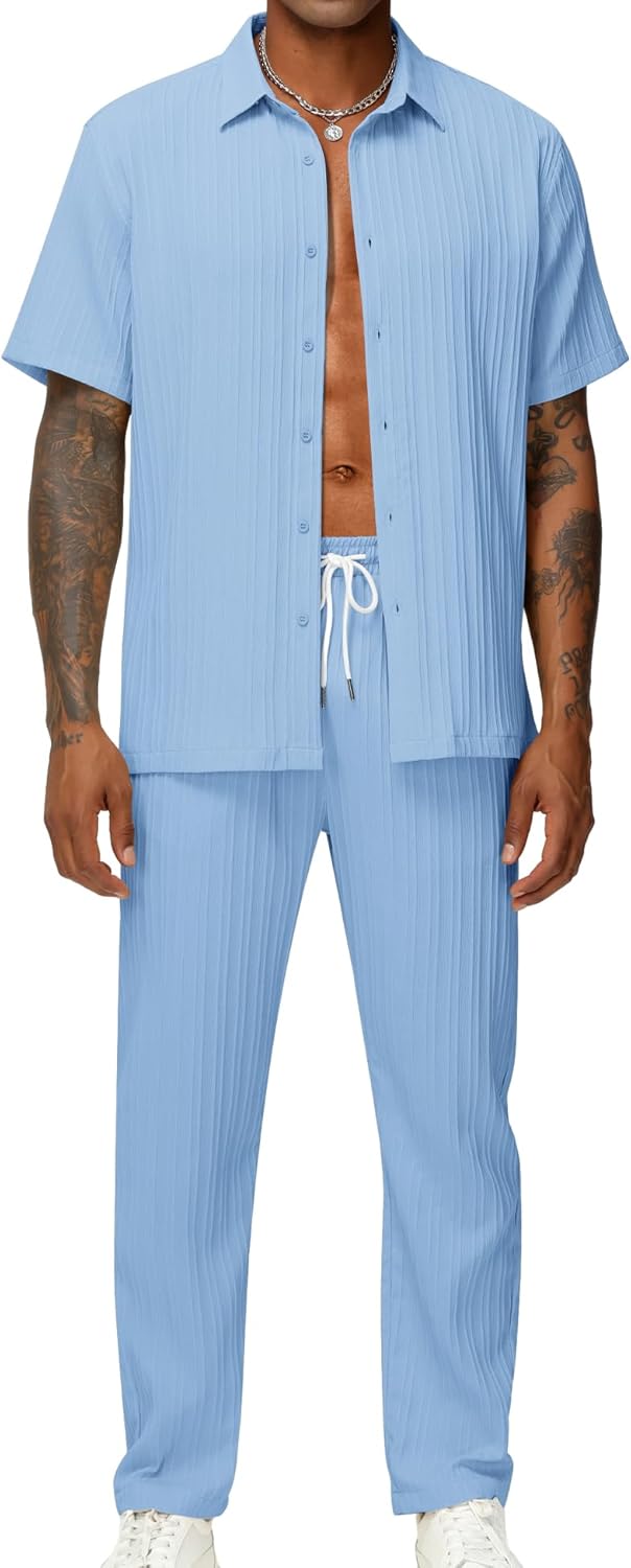 LecGee Men’s 2 Piece Vertical Striped Textured Outfits Summer Casual Button Down Shirts And Pants Matching Sets