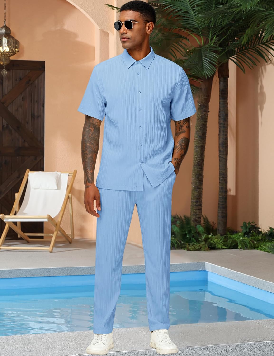 Be the first to review “LecGee Men’s 2 Piece Vertical Striped Textured Outfits Summer Casual Button Down Shirts And Pants Matching Sets”