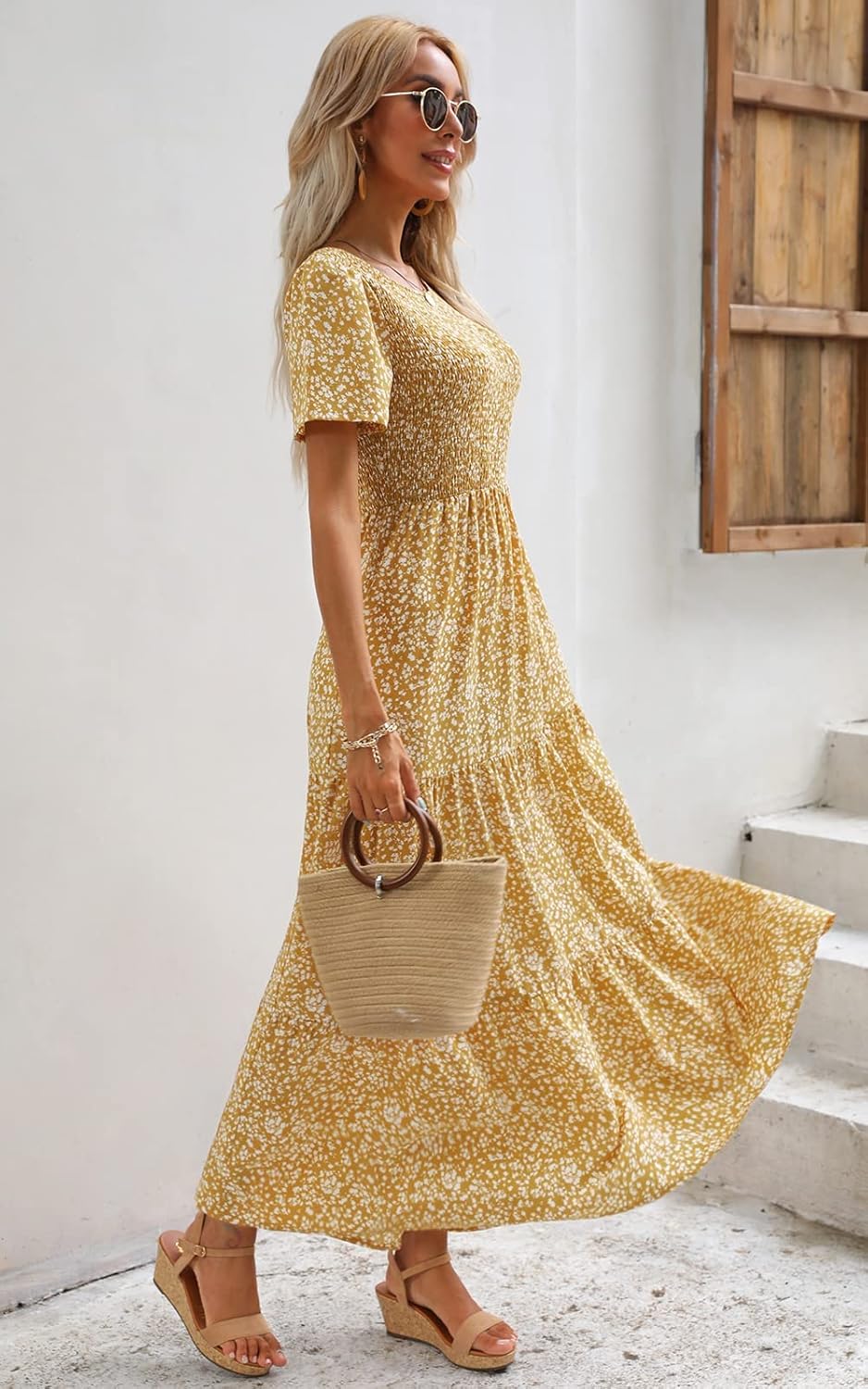 Maggeer Womens 2025 Spring Summer Smocked Wedding Guest Maxi Dress Casual Short Sleeve Floral Boho Flowy Long Dress