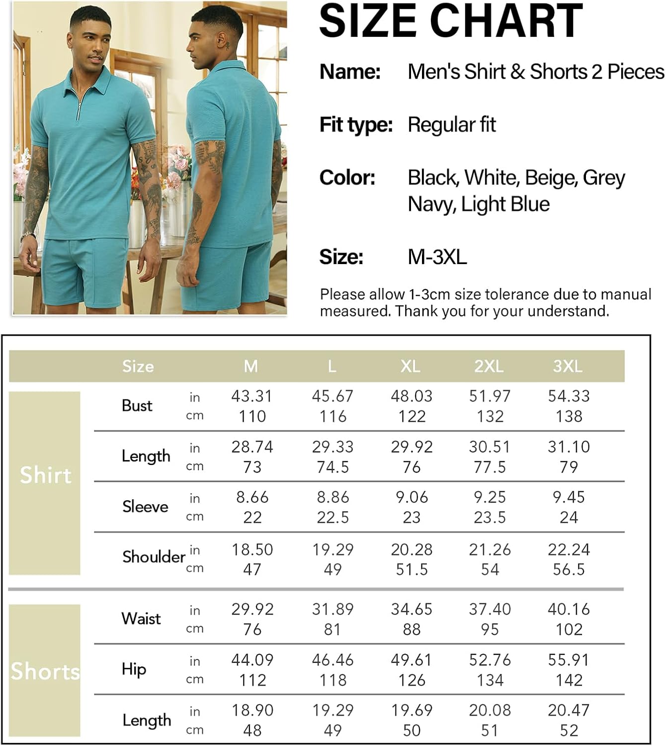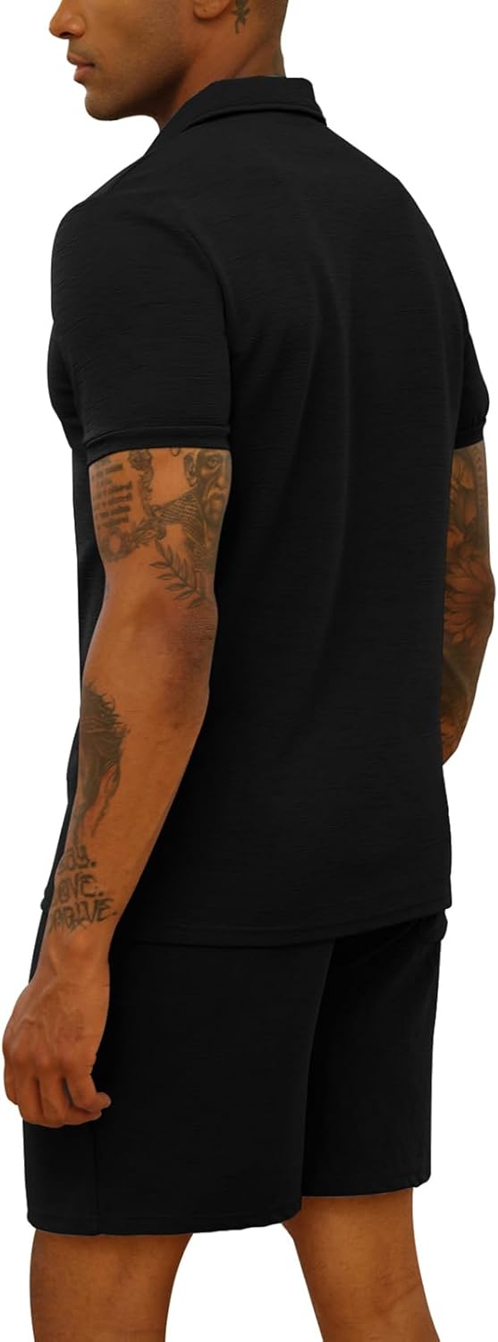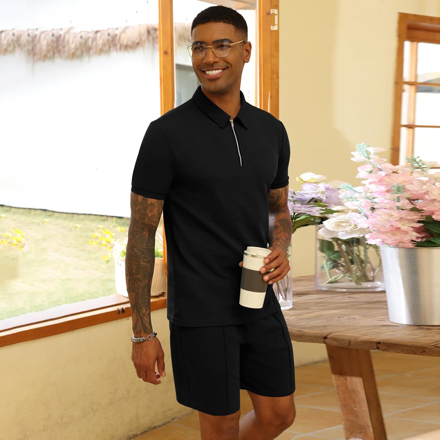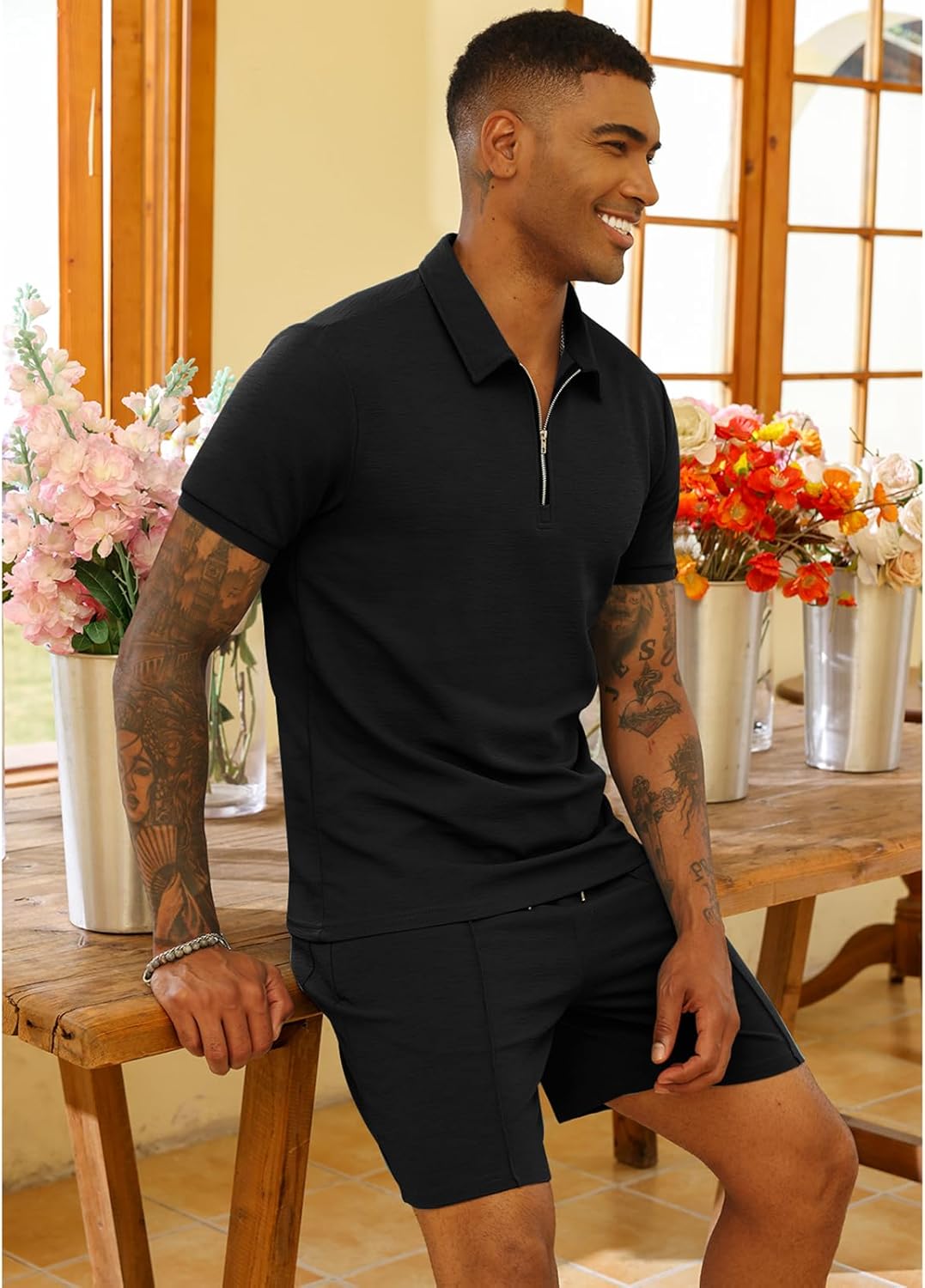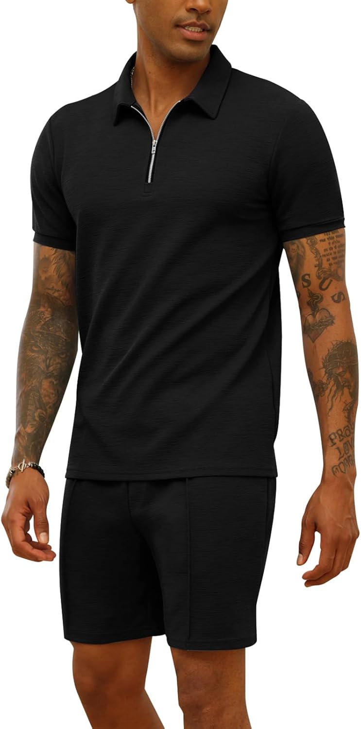 Mens 2 Piece Zip Tracksuit Short Sleeve Printed Polo Shirt and Shorts Pants Sets Summer Casual Outfits for Men