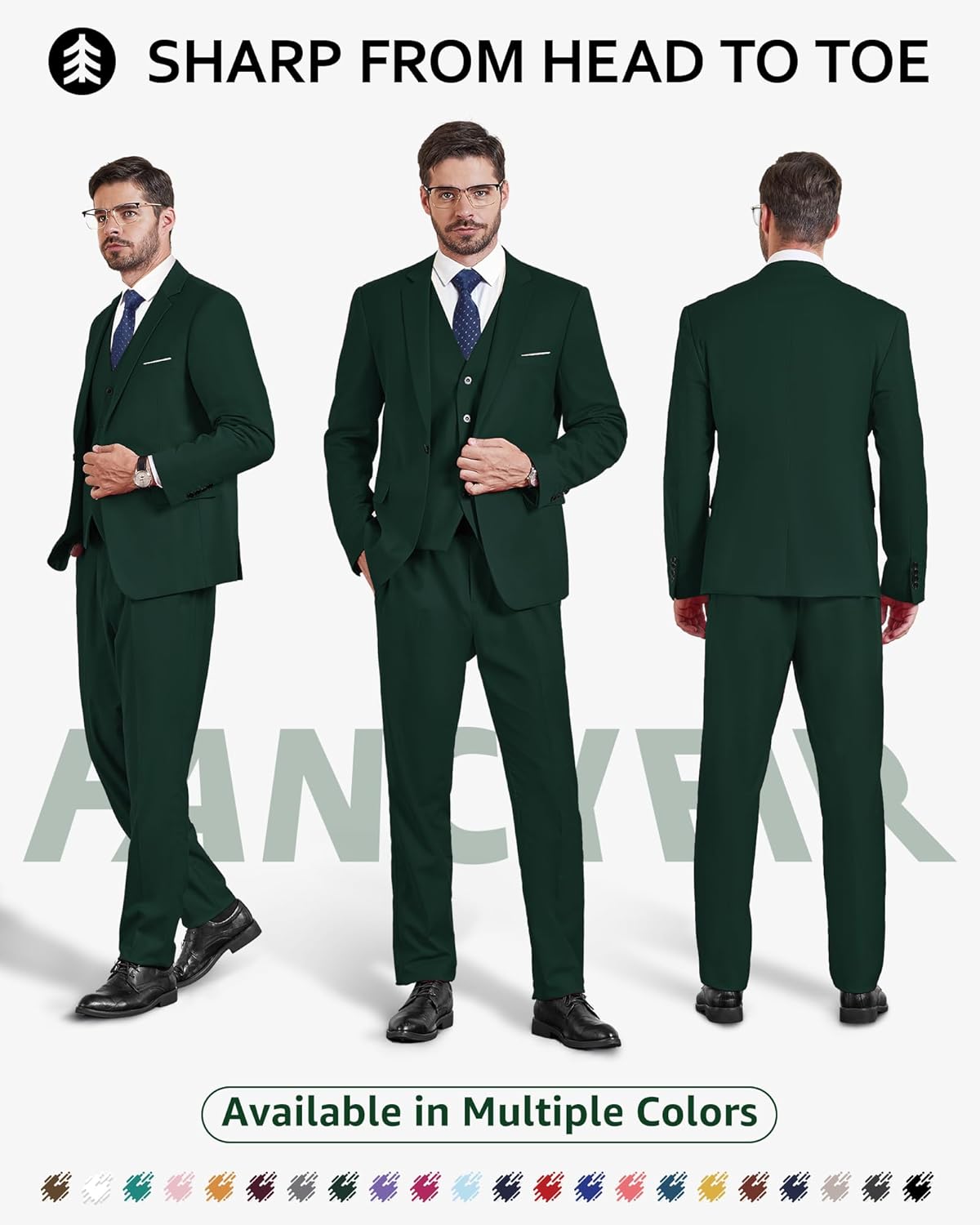 Men’s 3 Pieces Suit, Solid Slim Fit One Button Blazer Set, Jacket Vest Pants with Tie for Wedding Party Business