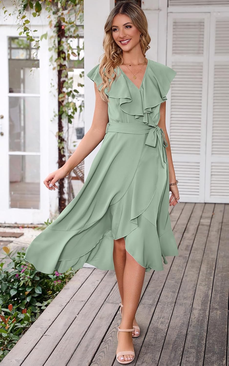 HIGHLIGHTS:Sleeveless with ruffles front add a sense of cute and feminine touchAdjustable tie waist womens dress to curve your beautiful bodyFixed wrap dress for women is easily to put on and take off