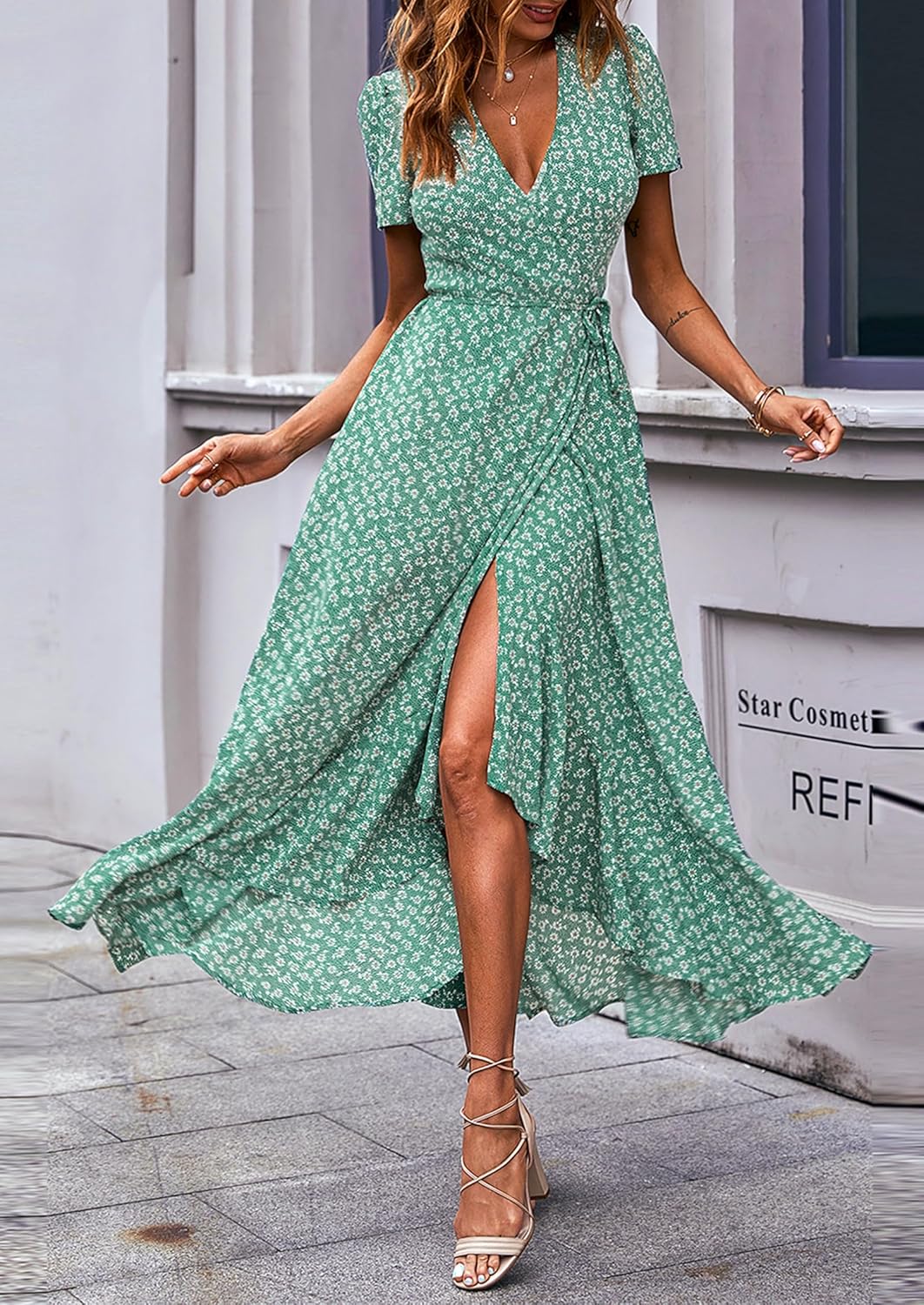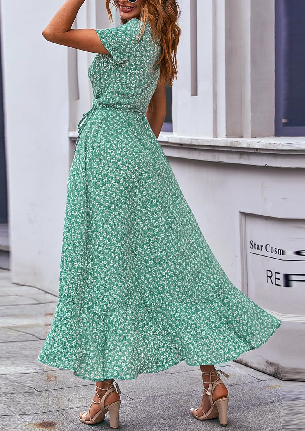 PRETTYGARDEN Women’s Summer Wrap Maxi Dress Casual Boho Floral V Neck Short Sleeve Ruffle Hem Split Beach Long Dresses
