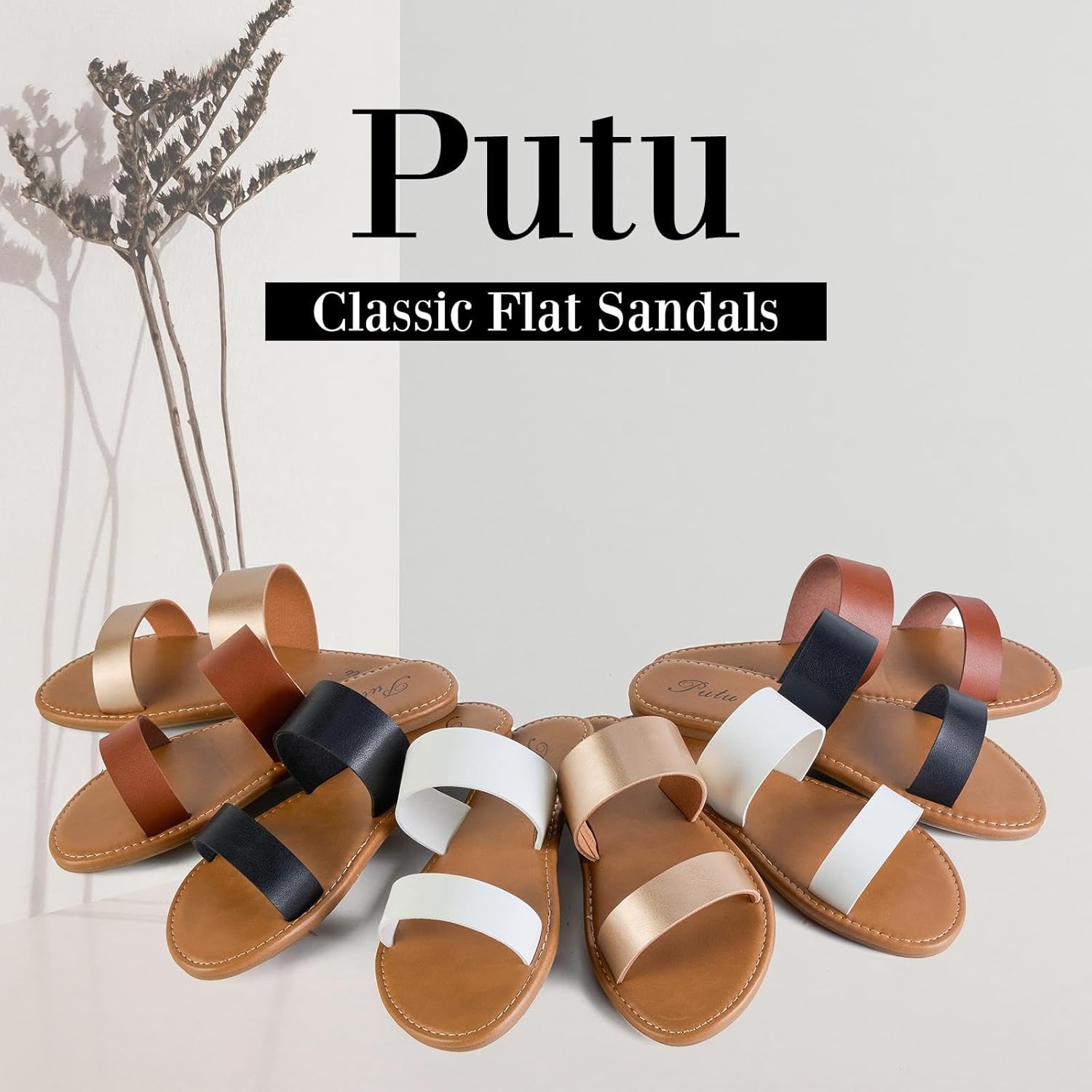 Putu Women’s Two Strap Flat Sandals Casual Slide Sandals for Wide Feet