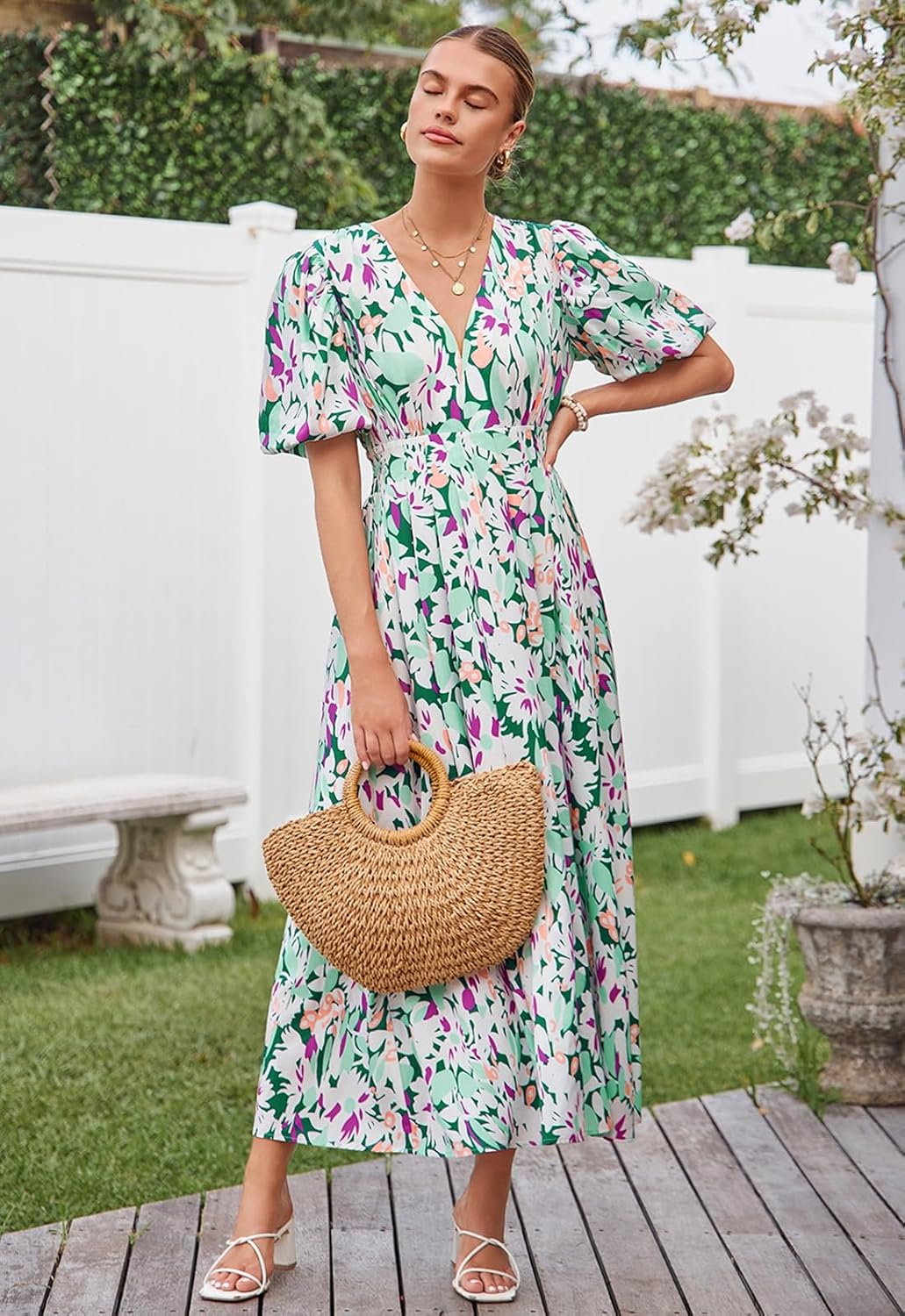 Design: Women’s summer midi dress, floral/solid look, puffed elasticated sleeves, plunge v-neck, smocked/empire waist design, A-line fit dress.