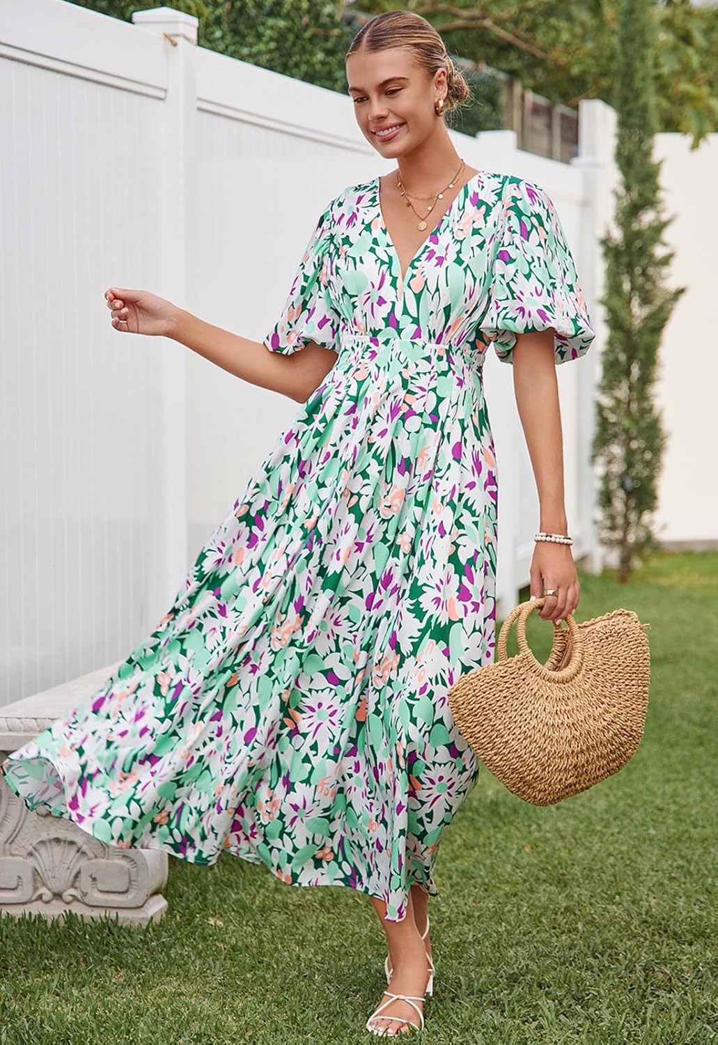 The video showcases the product in use.The video guides you through product setup.The video compares multiple products.The video shows the product being unpacked. Boho Floral Summer Midi Dress 2025 Merchant Video