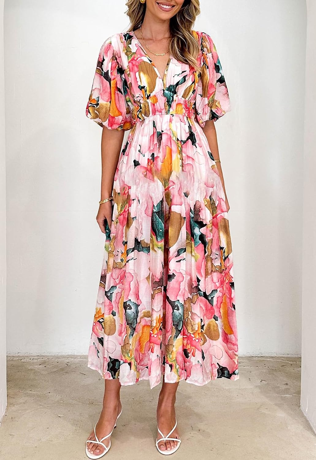 Design: Women’s summer midi dress, floral/solid look, puffed elasticated sleeves, plunge v-neck, smocked/empire waist design, A-line fit dress.