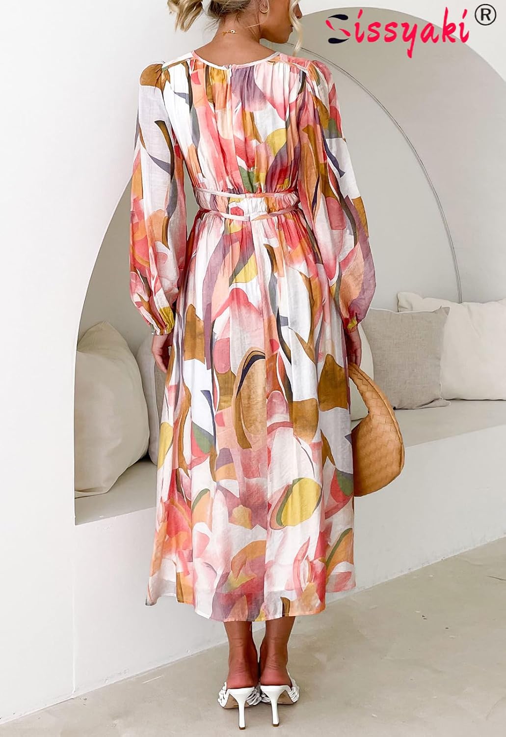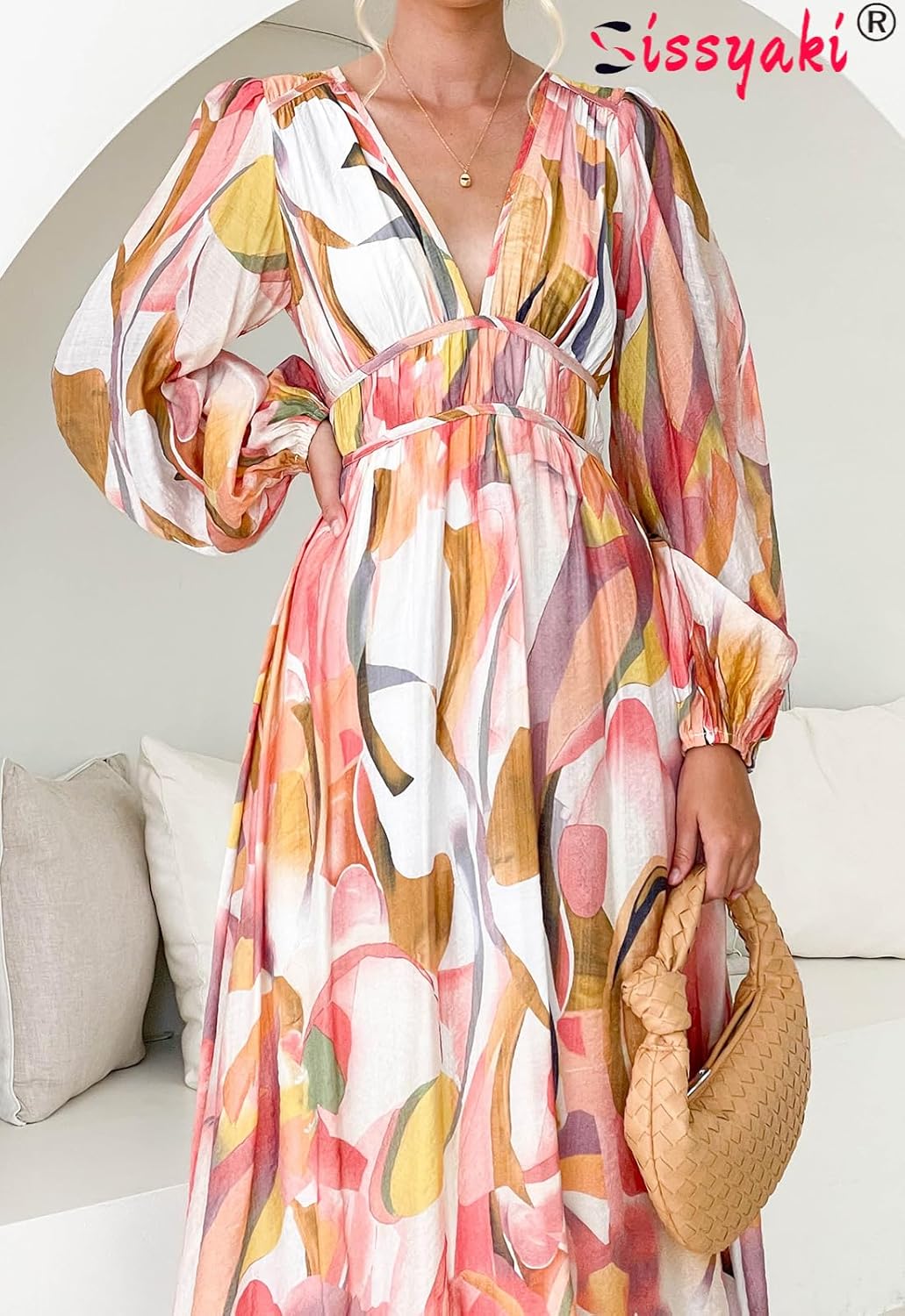 Sissyaki Women’s Long Sleeve Boho Floral Maxi Dress Smocked Beach Flowy Dress