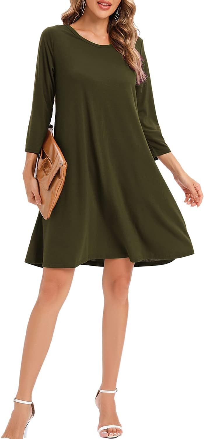 Women’s 3/4 Sleeve Damask Floral Printed Tunic Dress Bohemian Swing Casual Midi Dress With Pocket Tunic Blouses For Leggings
