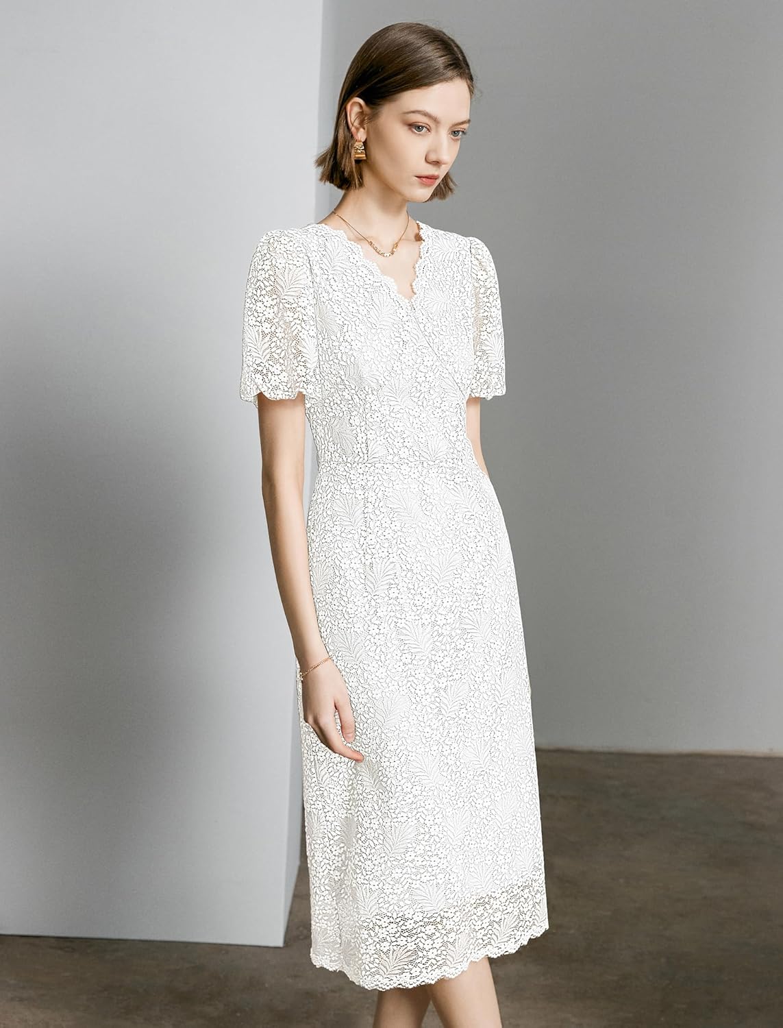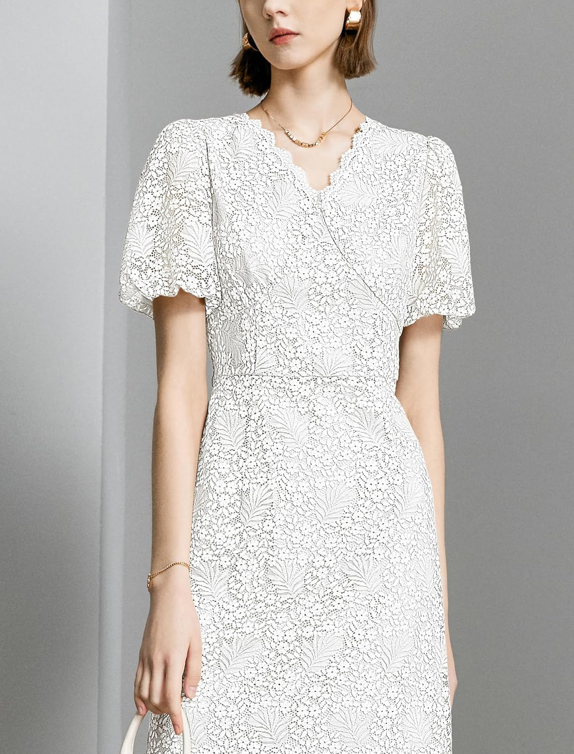 Women’s Elegant Lace Floral V-Neck Dress with Puff Sleeves and Back Zipper, Romantic and Timeless Design